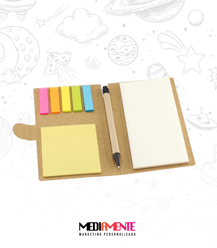 Memo set Ecológico Grande de Cartón natural. Incluye Bolígrafo Ecológico, 50 notas adhesivas amarillas claras grandes de 14.4 x 7.5 cm, 25 notas adhesivas amarillas medianas de 7.7 x 7.7 cm y 125 banderitas adhesivas de colores de 4.5 x 1.3 cm.
