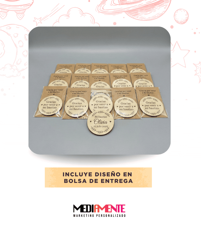 El modelo R107 transforma el clásico recuerdo en un accesorio decorativo para el hogar. Al ser un imán de 6 cm fabricado en MDF, tus invitados podrán colocarlo en su refrigerador, manteniendo vivo el recuerdo de tu evento.